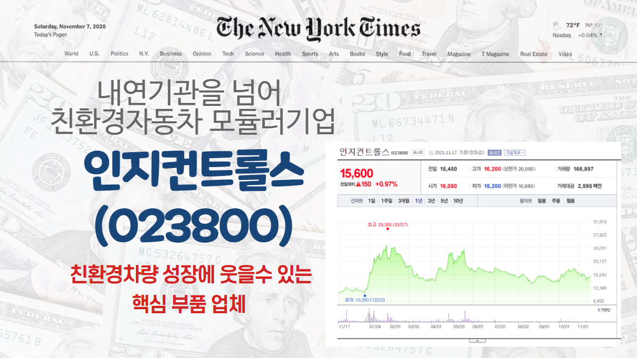 인지컨트롤스 는 SK이노베이션이 현대차 모듈 제조 참여한 이력도 있으며, 이를 바탕으로 사업 영역 확장으로 모듈 개발, 설계 프로젝트 참여을 발판으로 현재에는 모듈러 부품업체로 성장 하였습니다. 현재 SK이노베이션에서 셀을 받아 모듈을 제작하고 단순 모듈 제조가 아닌 100여 가지 부품을 직접 소싱할 만큼 실력이 뒷받침되는 기업입니다. 환경오염으로 친환경차량이 더욱 부각될 때 인지컨트롤스는 친환경차량에 적용가능한 매출 포트폴리오를 다변화로 가지고 있는점도 핵심포인트입니다. 전기차 배터리 모듈 매출 가시화, 전기차용 CCV M/S 확대 , 수소용 CCV와 열관리 통합 모듈 및 연료전지 시스템 개발로 포토폴리오를 다각화 진행 중에 있습니다.