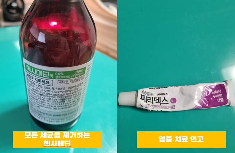 지금 이 글을 읽고 계신 이들은 지옥과 같은 통증에서 빨리 벗어나는 방법 알려드립니다!! 우선은 입안 세균이 번식할 수 없도록 '깨끗한 청결'부터 기본베이스로 깔고 들어갑니다. 다음으로는 많은 분에게 알려진 공포의 알보칠을 도포해 염증을 지져버려 한번 세게 아프고 낫는 약을 사용을 하는 것으로 많이들 알려져 있으나, 어느 순간 알보칠을 며칠을 도포하였음에도 낫는 기미가 없을 때, 제가 찾은 구내염 빨리 낫는 치료 노하우를 아낌없이 알려드리겠습니다. 준비물을 2개만 있으면 됩니다. 가글액 헥소메딘 과 연고 페리덱스 있으며 됩니다. 먼저 헥소메딘은 살균소독제로 약국에서 쉽고 저렴하게 살 수 있으며 소독과 살균에 좋아 입안의 소독에 큰 도움을 줍니다. 그러나 유의를 해야 될 점은 이 헥사메딘은 연속해서 사용 시 치아 변색 혹은 구강 내 세균을 모두 제거함으로써 나타나는 세균 불균형 칸디다증이 올 수 있으니, 연속해 사용은 권하지 않습니다. 다음은 페리덱스 연고로 헕은 부위를 약으로 발라 염증을 완화하도록 합니다. 하루 이틀 만 제가 알려드린 방법을 시행한다면 나를 괴롭혔던 구내염은 안녕~~ 하는 모습을 겪을 것입니다.